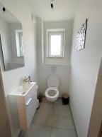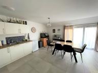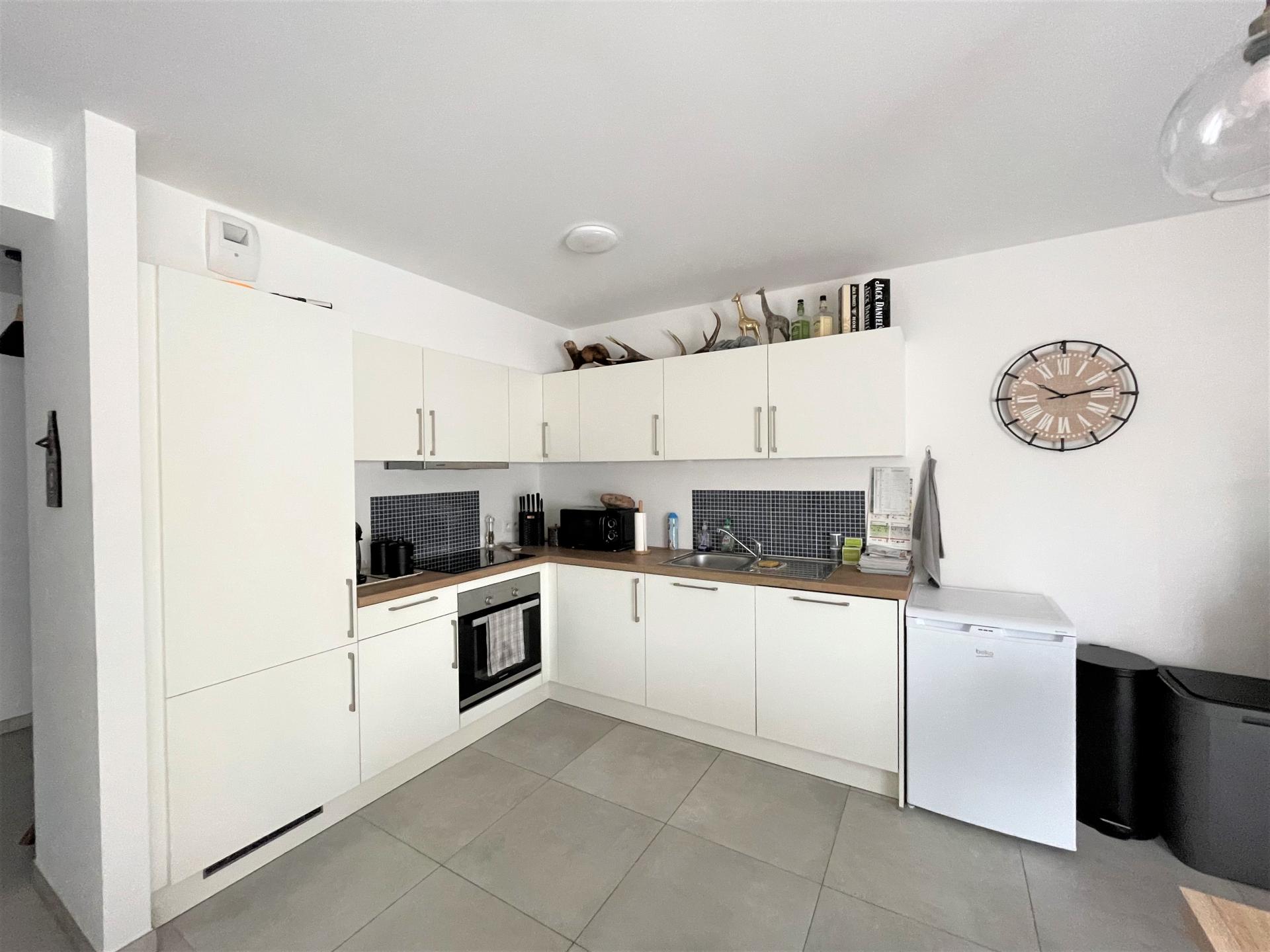 Un hall d'entrée, un grand séjour ouvert sur une cuisine équipée (frigo, four, plaque vitrocéramique, hotte, lave-vaisselle), un balcon, 2 chambres, une buanderie, un WC et une salle de bains (baignoire, douche, meuble lavabo).